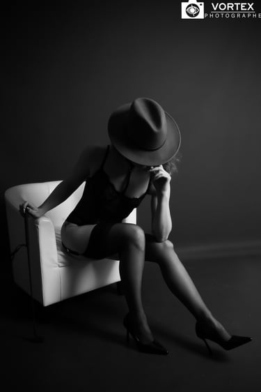Boudoir et glamour au studio à Quimper : lumière maîtrisée, atmosphère confidentielle, lingerie fine et portraits sexy, toujours avec élégance.